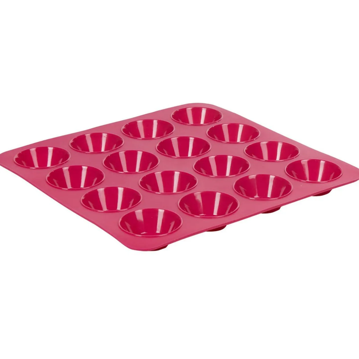 Moule carré en silicone de couleur rose avec empreintes pour la cuisson de 16 petits fours.