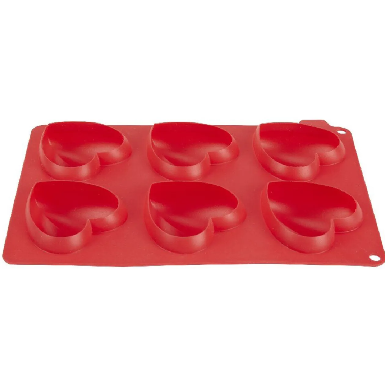 Moule rectangulaire en silicone rouge pour la cuisson de 6 pâtisseries individuelles en forme de coeur.