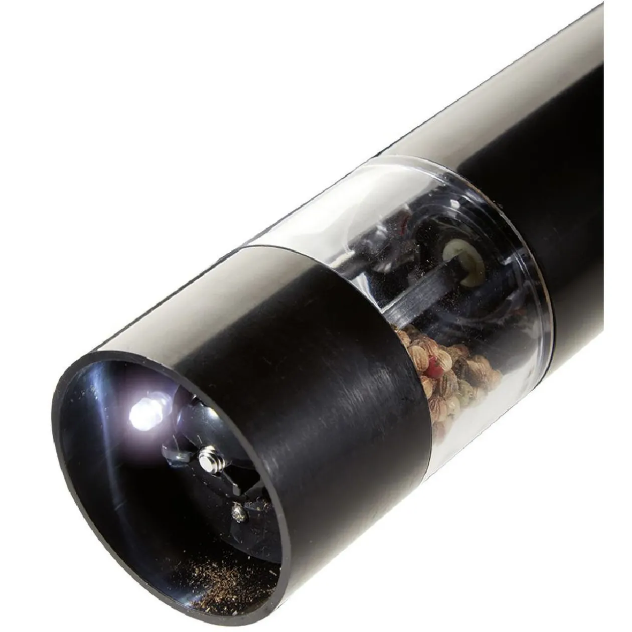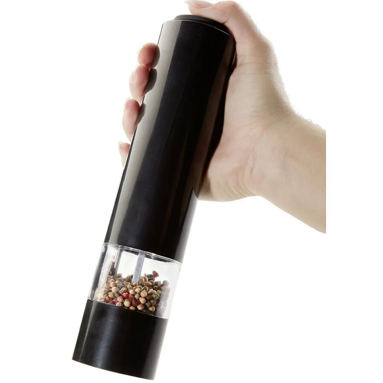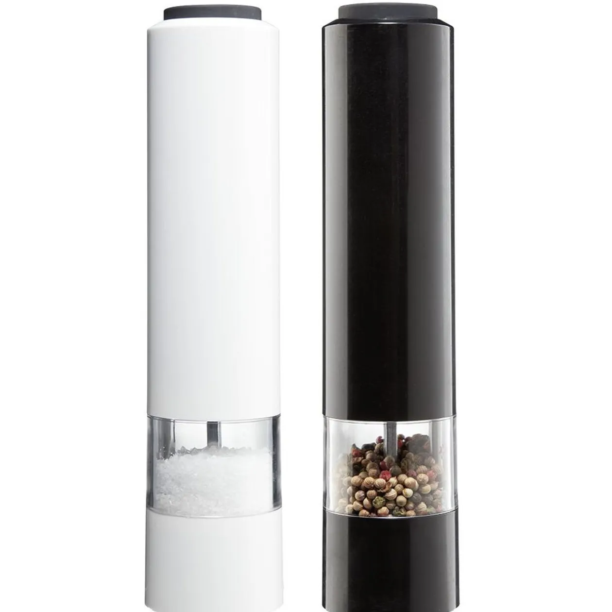 Lot de 2 moulins électriques, un de couleur blanche, idéal pour le sel, et l’autre de couleur noire, parfait pour le poivre.