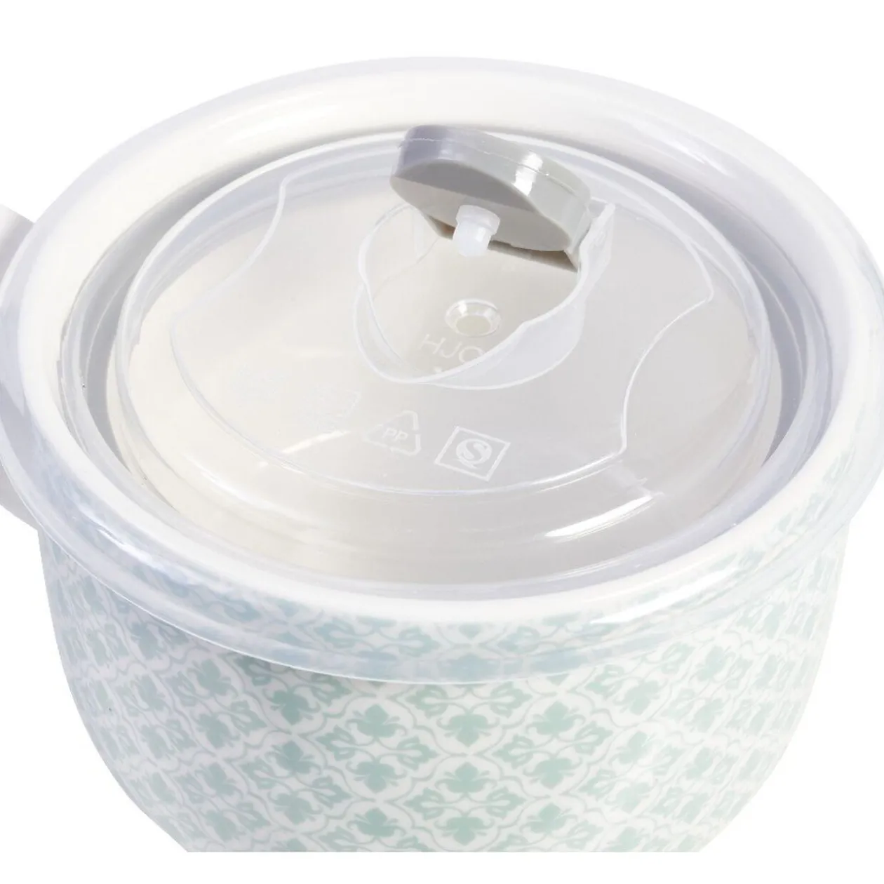 Ce produit existe en 4 modèles, modèle aléatoire selon disponibilité en magasin. -Dimensions: l 13 x L 8 cm. – Matières: couvercle: Polypropylène, Mug: porcelaine.