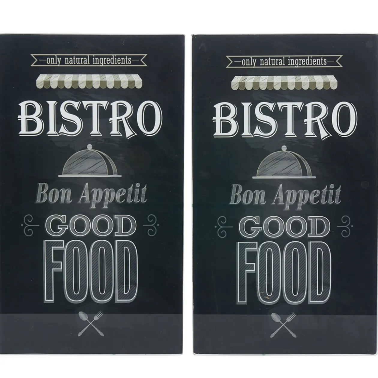 Lot de 2 planches à découper cache plaque en verre noir avec inscription blanche pour une cuisine d’inspiration rétro.