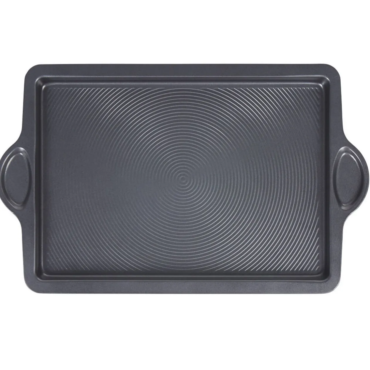 Pratique, cette plaque de cuisson en métal gris comprend un revêtement à fond texturé pour un démoulage facile de vos pâtisseries