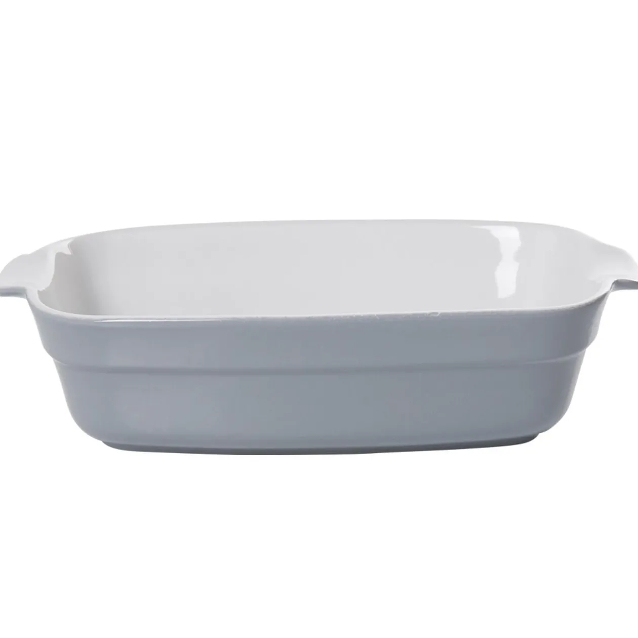 Plat à four rectangulaire de couleur gris à l’extérieur et blanc à l’intérieur.