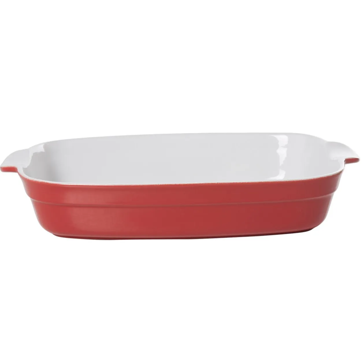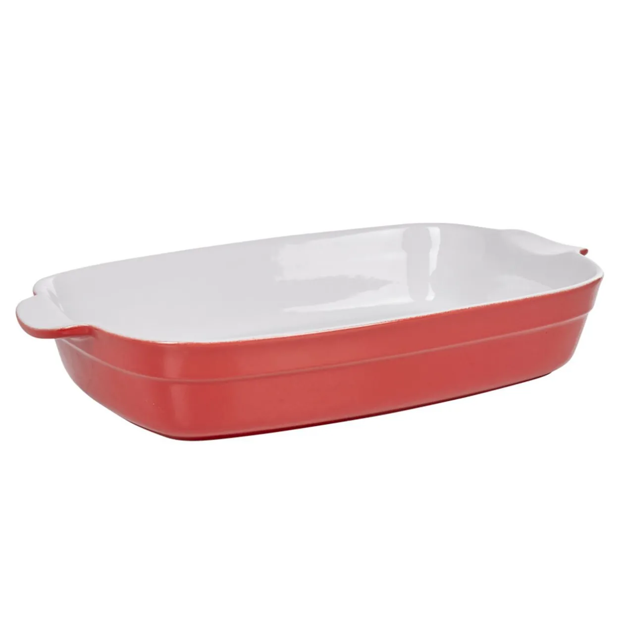 Plat à four rectangulaire grand format de couleur rouge à l’extérieur et blanc à l’intérieur.