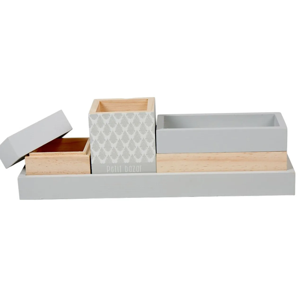 Ce plateau déco gris clair naturel est composé de 3 compartiments de rangement dont une boîte avec couvercle.