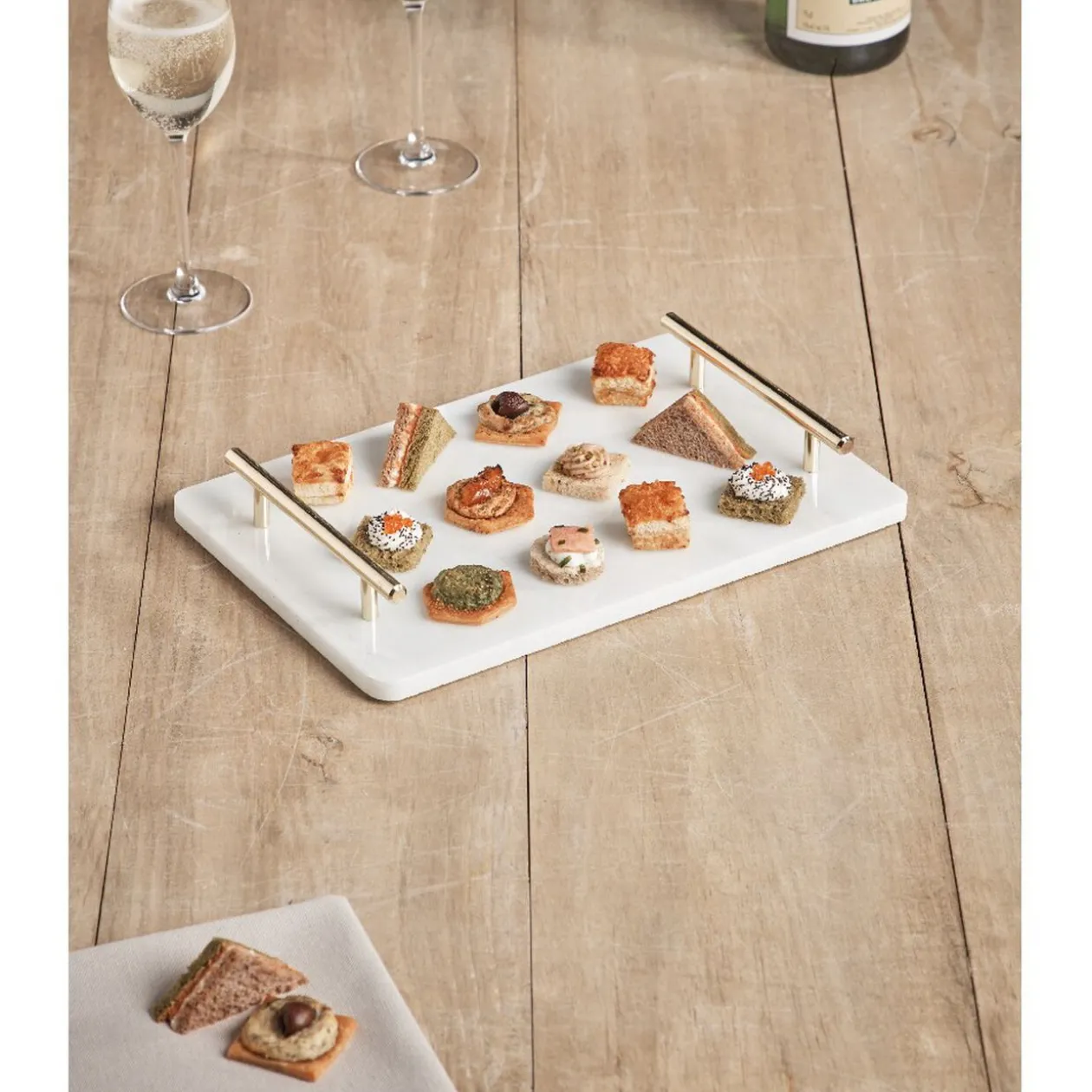 Amenez de la classe à votre table basse avec ce plateau de service qui vous vaudra la meilleure présentation. Disposez votre apéritif sur ce chic plateau en marbre orné de deux anses dorées. Idéal pour les fêtes de fin d’année, régalez-vous avec des roulés au saumon, des blinis au caviar ou des fourrés aux Saint-Jacques.