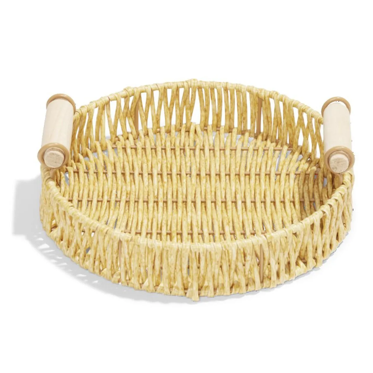 Ce plateau de service rond doté de poignées est parfait pour apporter une touche rustique et élégante à vos réceptions.