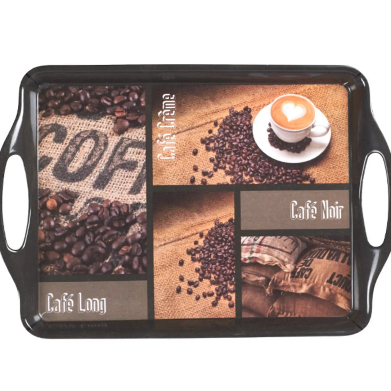 Plateau au motif Café, muni de 2 poignées pour une meilleure prise en main. Matière : plastique mélaminé. Dimensions : 50,5×34,5×3,3 cm.