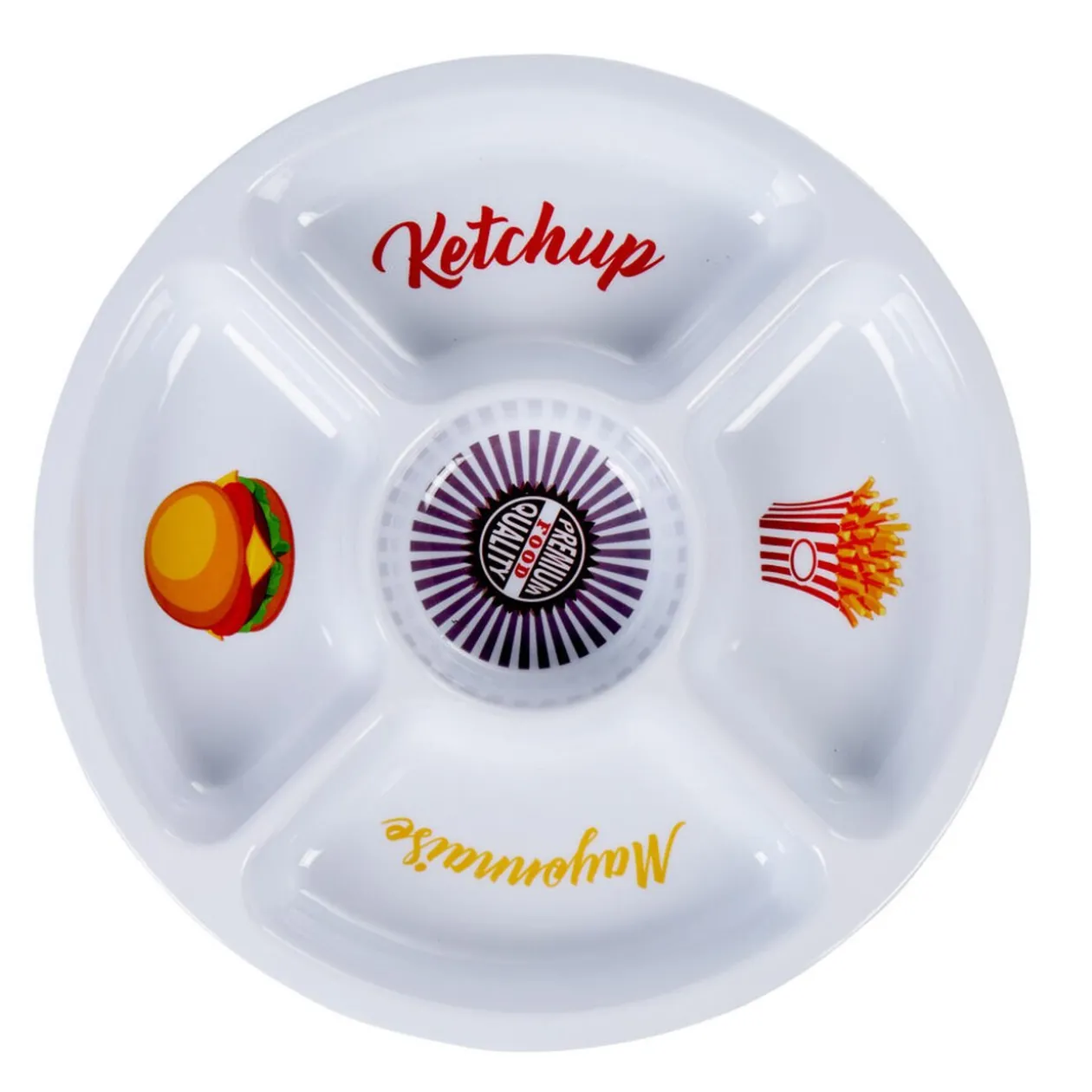 Optez pour ce plateau rond en plastique mélaminé design fast food composé de 5 compartiments, il vous servira pour la présentation des mini-burgers, frites et sauces variées mais aussi pour le service des petits apéritifs.
