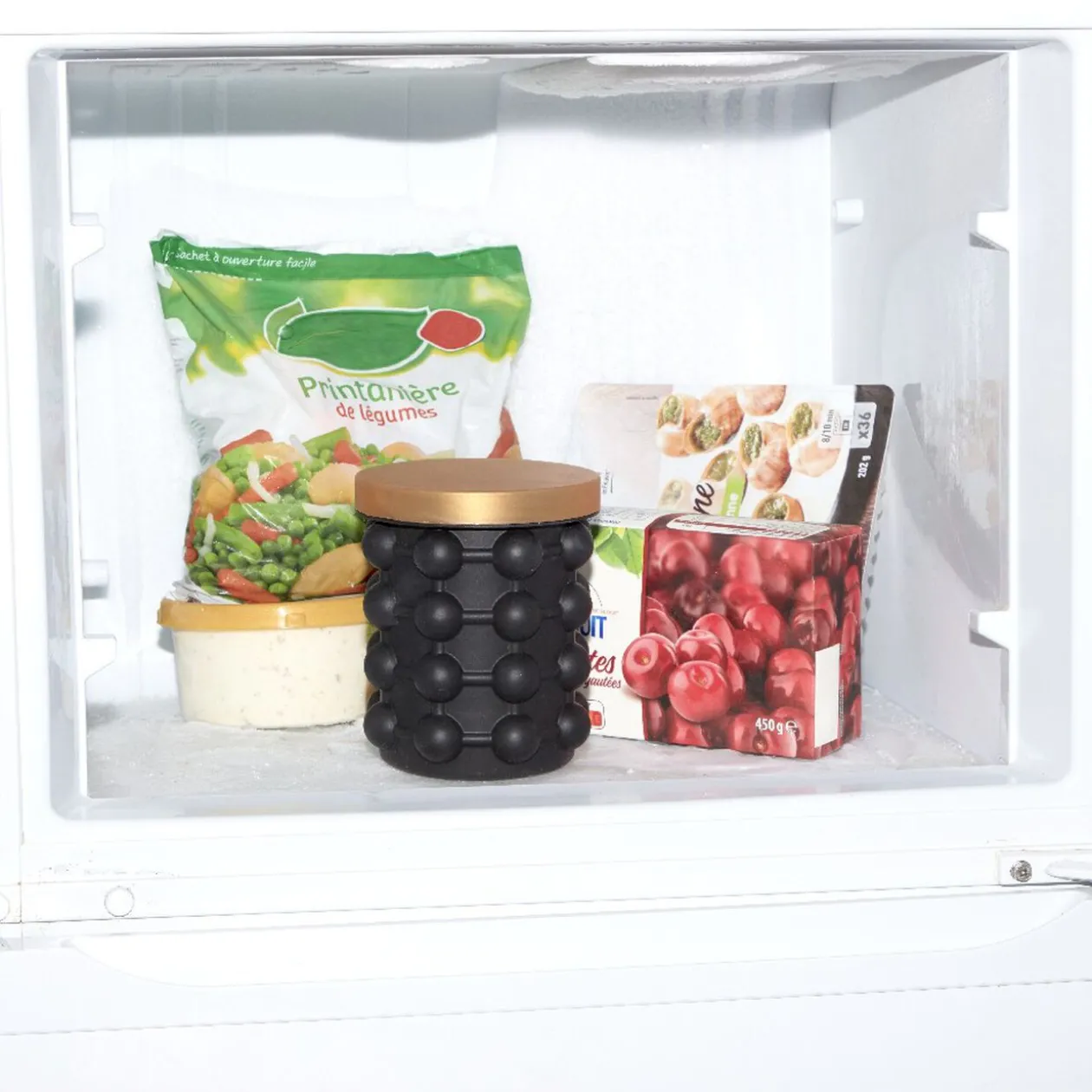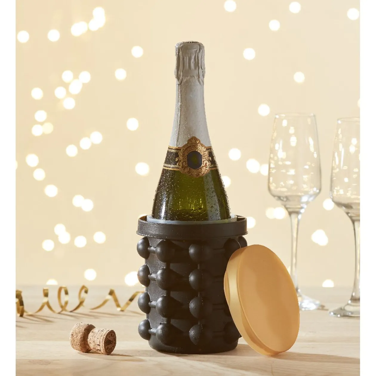 Ce rafraîchisseur 2 en 1 noir et doré vous permet à la fois d’y entreposer votre bouteille et la garder au frais mais il vous permet aussi de faire des glaçons en plus de leur facilité à démouler. Mettez de l’eau entre le rafraîchisseur et le compartiment intérieur, puis placez-le dans votre congélateur.