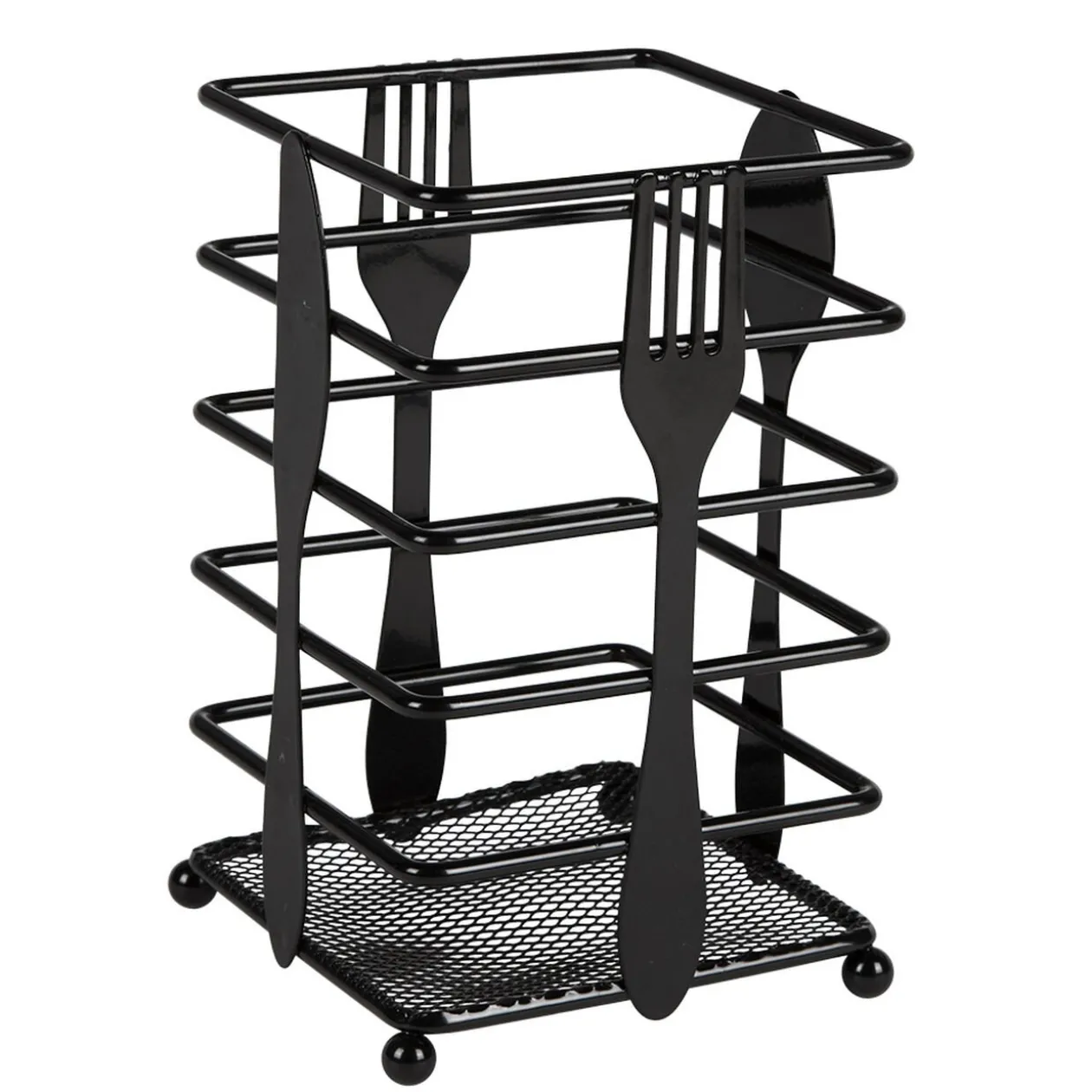 Range couvert en métal avec 2 fourchettes, 1 cuillère et 1 couteau fantaisies sur chaque côté. La partie inférieure étant ajourée, l’eau ne stagnera pas, vous pourrez donc directement disposer vos couverts après lavage.