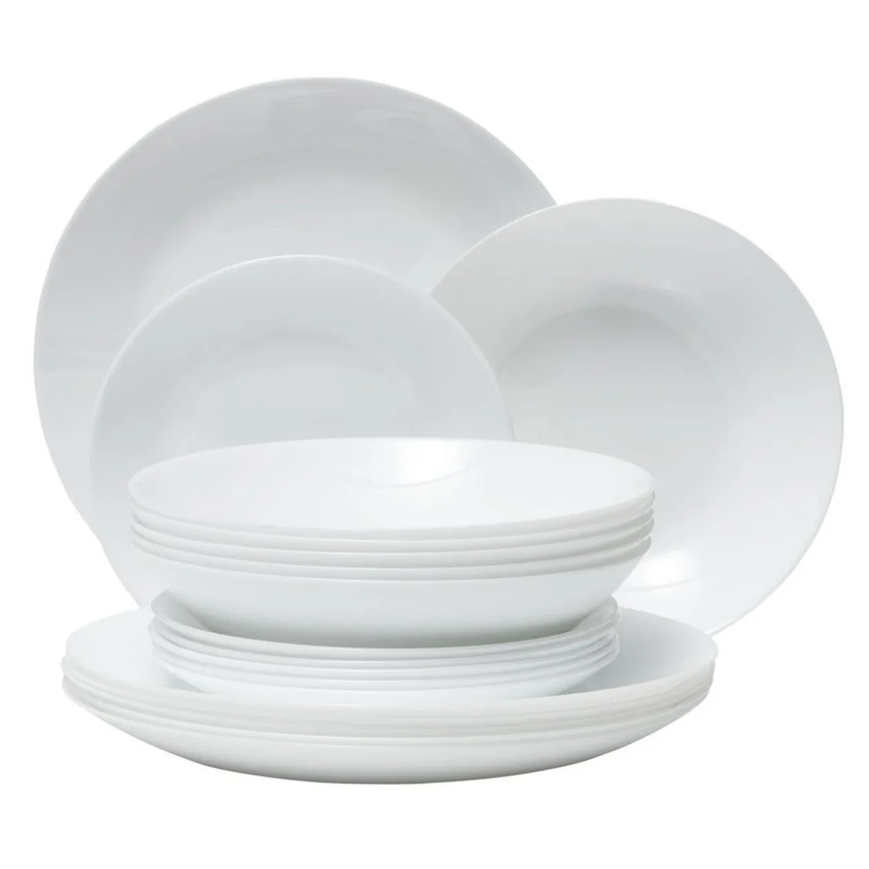 Service 18 pièces Arcopal comprenant 6 assiettes plates ø 25 cm, 6 assiettes creuses ø 20 cm et 6 assiettes à dessert ø 18 cm, verre résistant.