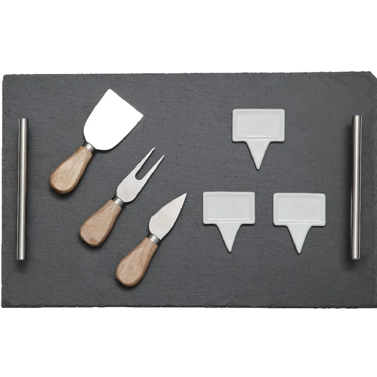 Le service à fromages haut de gamme pour vos repas. Avec ce superbe plateau en ardoise, proposez différentes variétés de fromages à vos convives et servez-les facilement grâce à ses 2 anses. Indiquez les noms de vos produits laitiers grâce aux 3 porte-noms inclus pour un effet chic et bistrot garanti.