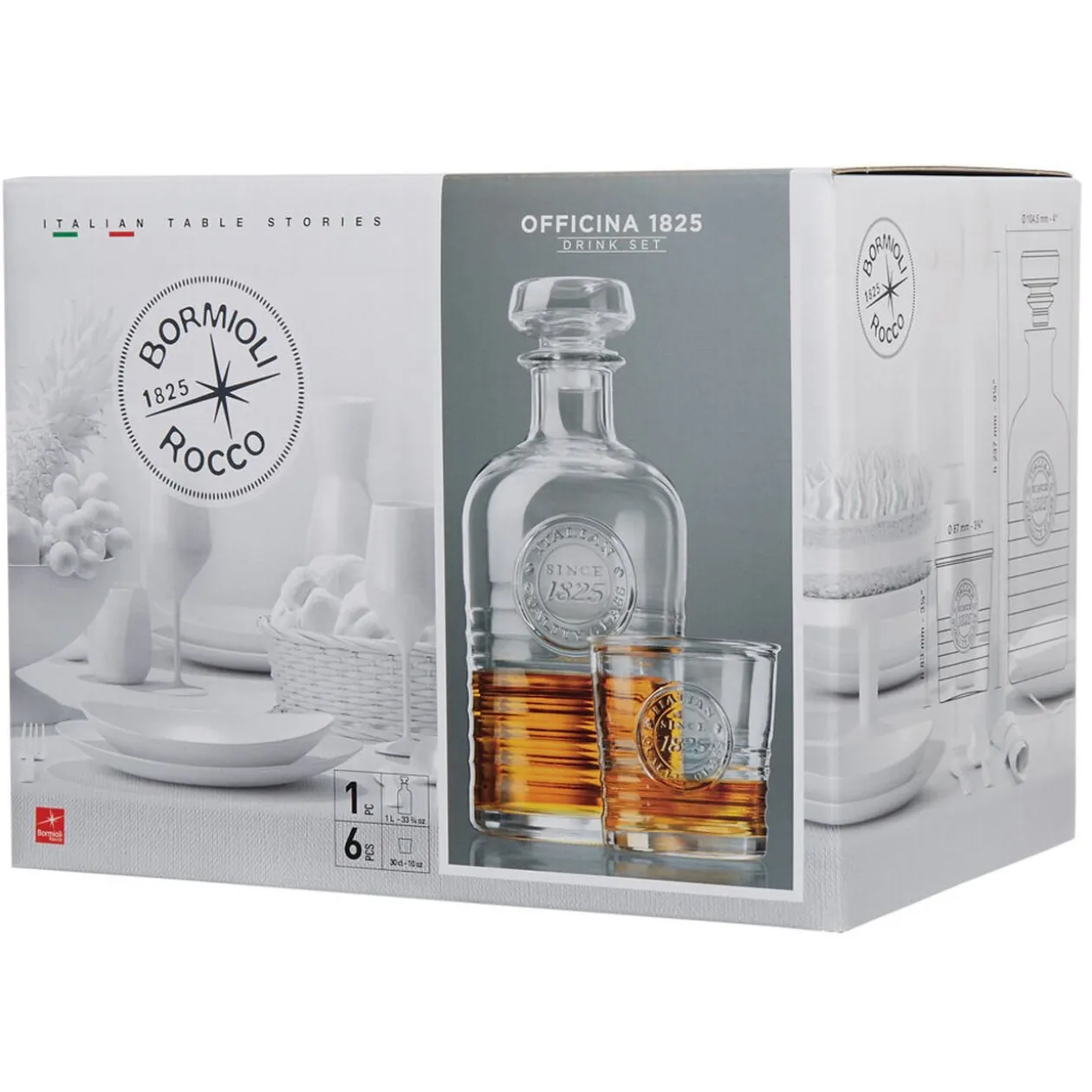Set composé d’une carafe transparente et 6 verres à rhum de la collection Officina de Bormioli Rocco.