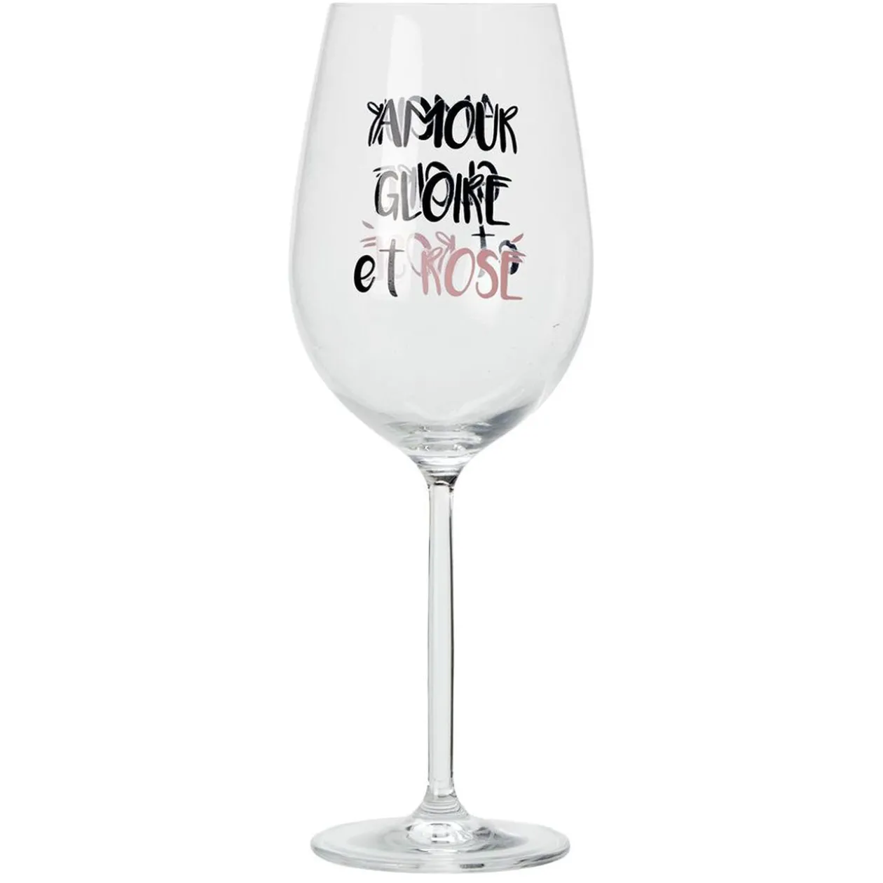 Verre à vin XL avec inscription humoristique « Amour Gloire et Rosé », idéal pour des soirées dégustation festives.