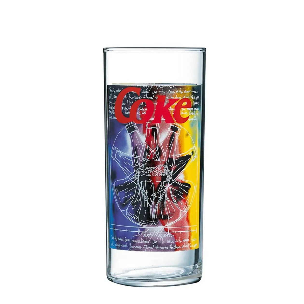 Verre Coca-Cola tubo avec motifs colorés et inscription « Coke » d’une contenance de 27 cl.